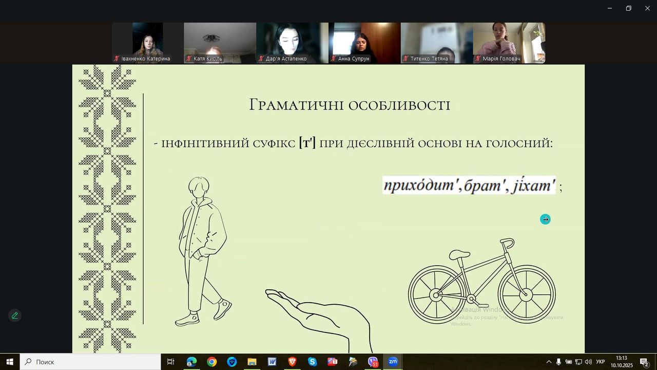 10 жовтня 2025 р. у Ніжині відбулися в змішаному форматі ВСЕУКРАЇНСЬКІ ГРИЩЕНКІВСЬКІ ЧИТАННЯ–2025, присвячені 220-й річниці від дня заснування Ніжинської вищої школи. Традиційно вони розпочалися з вітальних слів організаторів та співорганізаторів конференції. Потім, як і було зазначено в програмі конференції, на пленарному засіданні на платформі ZOOM із доповідями виступили представники різних вищих шкіл України. На жаль, ворожі нічні атаки унеможливили повноцінні виступи кількох заявлених осіб. Головувала Бойко Н. І., доктор філологічних наук, професор, в. о. завідувача кафедри української мови, літератури, культурології та журналістики Ніжинського державного університету імені Миколи Гоголя. Після короткої півгодинної перерви учасники продовжили роботу в секціях. Студенти факультету дошкільної, початкової освіти та мистецтв долучилися до діяльності секції 6. СУЧАСНИЙ ОСВІТНІЙ ПРОСТІР: ПРОБЛЕМИ ТА ПЕРСПЕКТИВИ. Керівником секції була Хомич Т. Л., к. філол. н., доц., завідувач кафедри української мови, літератури та журналістики Національного університету «Чернігівський колегіум» імені Тараса Шевченка. З-поміж заявлених доповідачів змогли виступити кілька. Власне, сама керівник секції ознайомила з темою “Порушення ортографійних норм у медійному просторі Чернігівщини”, продемонструвавши дотичну публікацію в журналі “Українська мова та література в школі”, закцентувавши на повторюваних помилках у медіа. Волк Тетяна, студентка філологічного факультету Національного університету «Чернігівський колегіум» імені Тараса Шевченка (керівник - Хомич Т. Л.), привернула увагу присутніх до теми”Лексико-стилістичні засоби творення психологічної напруги в романі Андрія Сем'янківа "Танці з кістками"", викликавши жваве обговорення. Труба Катерина, студентка філологічного факультету Національного університету «Чернігівський колегіум» імені Тараса Шевченка, вкотре зауважила в доповіді “Діалектні риси мікросистеми села Загребелля Сосницької селищної громади Корюківського району Чернігівської області” на важливості збереження діалектних рис українців, які допомагають нам ідентифікувати себе. Сазонова О. В., кандидат філологічних наук, доцент, доцент кафедри мов і методики їх викладання Національного університету "Чернігівський колегіум" імені Т.Г.Шевченка Візуалізувала тему “Формування художньо-образного мислення та розуміння теоретичних понять у здобувачів початкової освіти” розлогою презентацією.