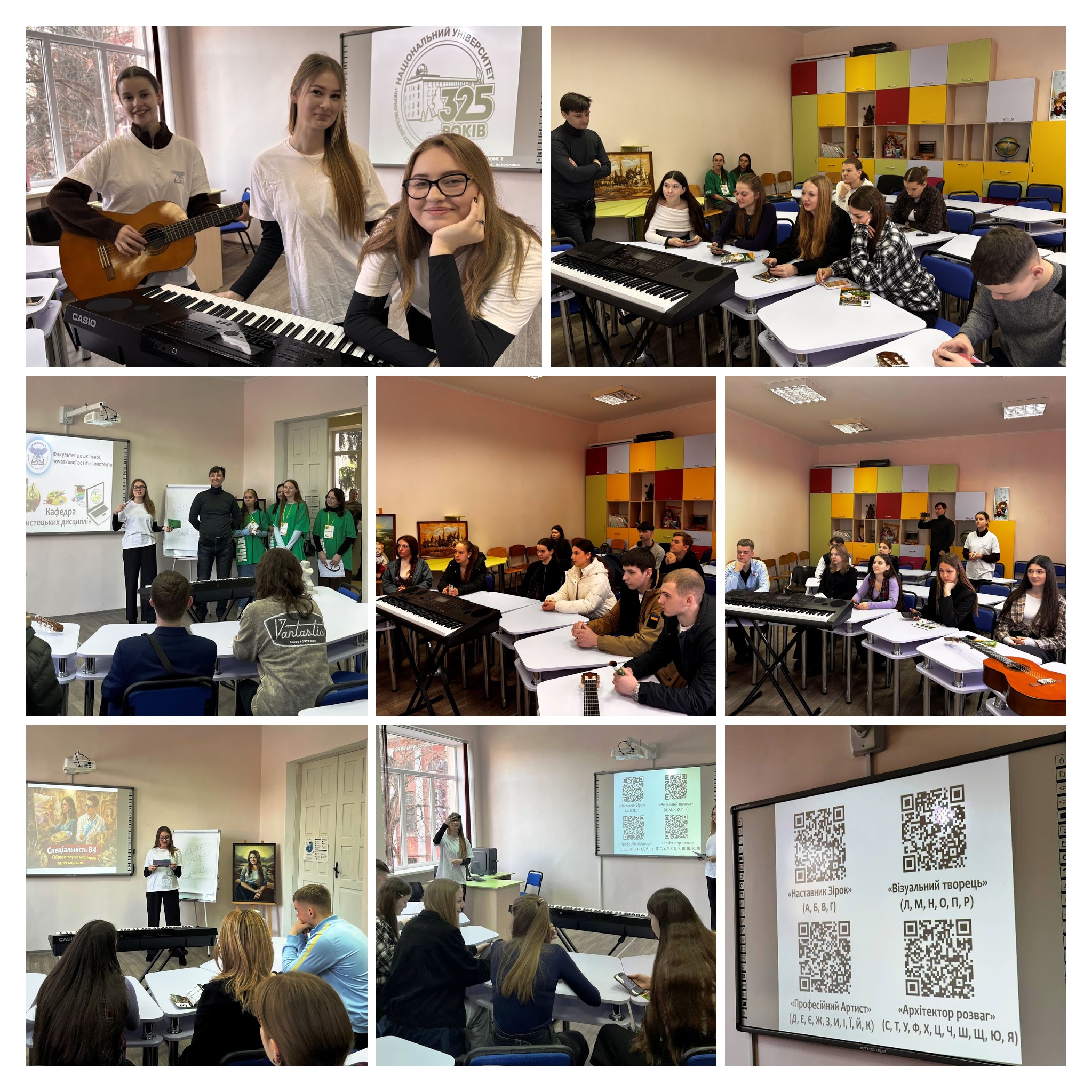 Креативно і весело викладачі і студенти в ігровій формі познайомили школярів зі спеціальностями кафедри: учні були розбиті на 4 команди «Наставник Зірок», «Професійний Артист», «Візуальний творець», «Архітектор розваг», кожна з яких зібрали правильно пазли та ознайомились з працевлаштуванням по кожній спеціальності кафедри.