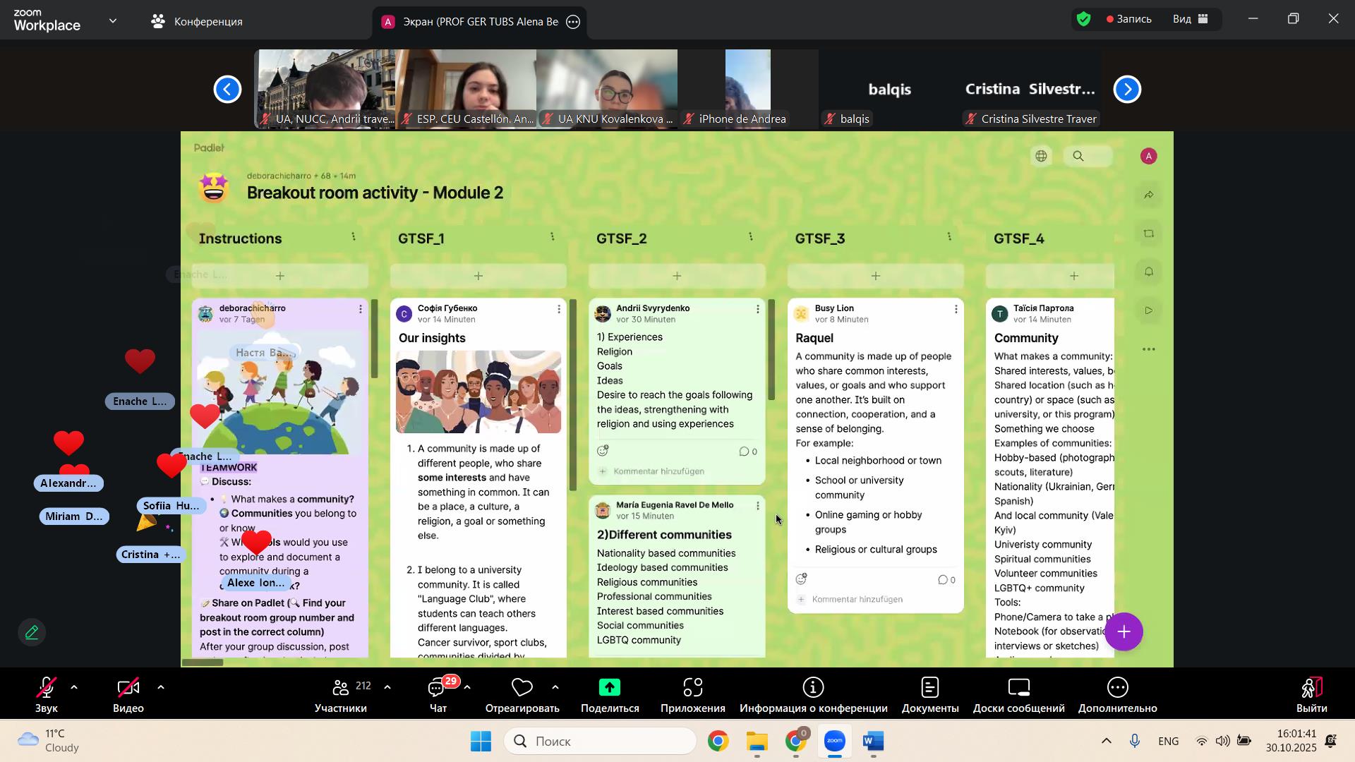 Друга частина зустрічі була присвячена груповій роботі. Студенти з різних країн мали можливість обговорити своє бачення поняття «спільнота», проаналізувати, до яких спільнот вони належать і яким чином можна їх дослідити. Свої ідеї вони відображали на онлайн-дошці Padlet, а потім презентували думки під час спільного обговорення.