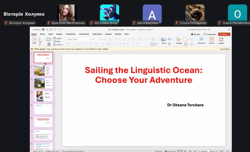 Майстерка «Мандруючи океаном лінгвістики: обери свій напрям» відкрила для студентів ширший погляд на те, чим сьогодні є лінгвістика. Заняття допомогло простежити, як усталені напрями переплітаються з новішими сферами: академічною грамотністю, мовною політикою, міждисциплінарними дослідженнями та використанням ШІ. Інтерактивні вправи та обговорення реальних прикладів досліджень допомогли студентам визначити, що їх цікавить найбільше, і побачити, як власний досвід може перетворитися на наукову гіпотезу.