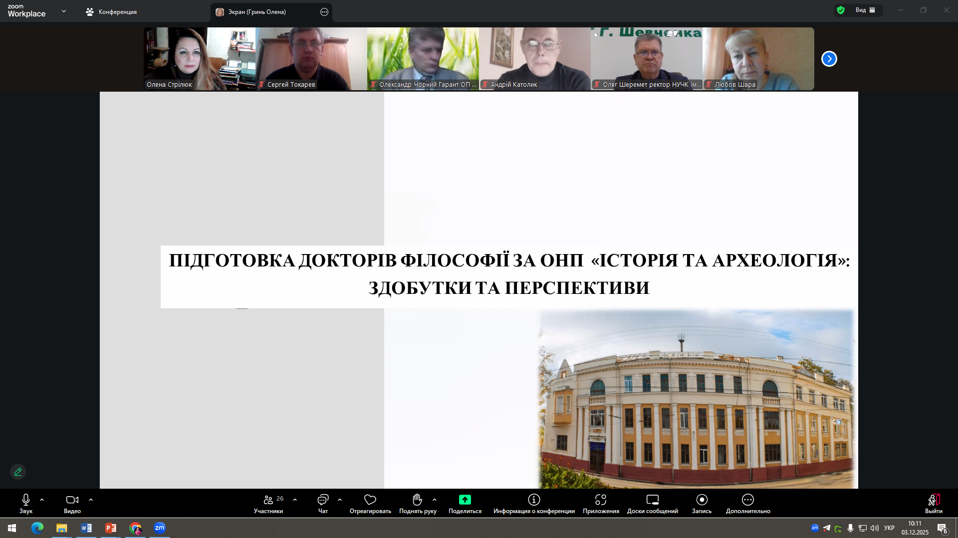 З пленарною доповіддю виступила к.і.н., доц. Гринь О. В., гарант ОНП «Історія та археологія», представивши аналіз сучасної моделі підготовки докторів філософії та перспективи розвитку наукових досліджень у галузі історії.