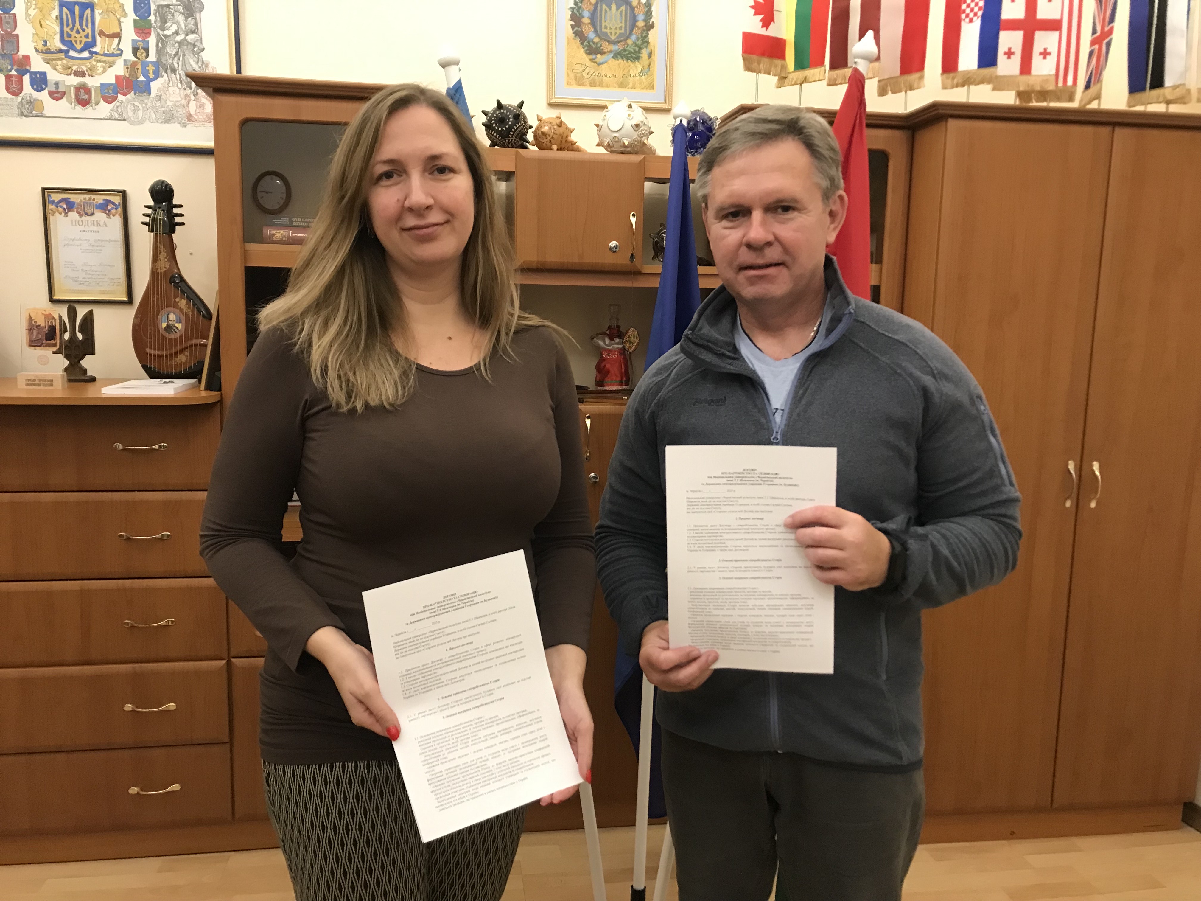 Голова Державного самоврядування українців Угорщини Євгенія Єдлічка та доцент кафедри мистецьких дисциплін НУЧК імені Т.Г. Шевченка Олег Воронко під час укладання «Договору про партнерство та співпрацю».