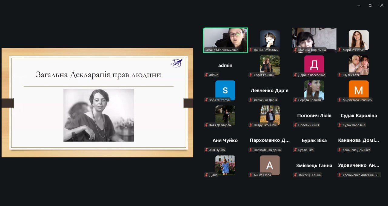 Оксана Мірошниченко, канд. юрид. наук, доцент кафедри права, філософії та політології ННІ історії та соціогуманітарних дисциплін імені О.М. Лазаревського Національного університету «Чернігівський колегіум» імені Т. Г. Шевченка, керуючий партнер АБ «Мірошниченко та партнери», розповіла про історію прийняття Загальної декларації прав людини, важливість даного документу в сучасному світі та закріплення основоположних прав людини в законодавчих актах України. Також вона поділилася власними юридичними кейсами по захисту прав людини.