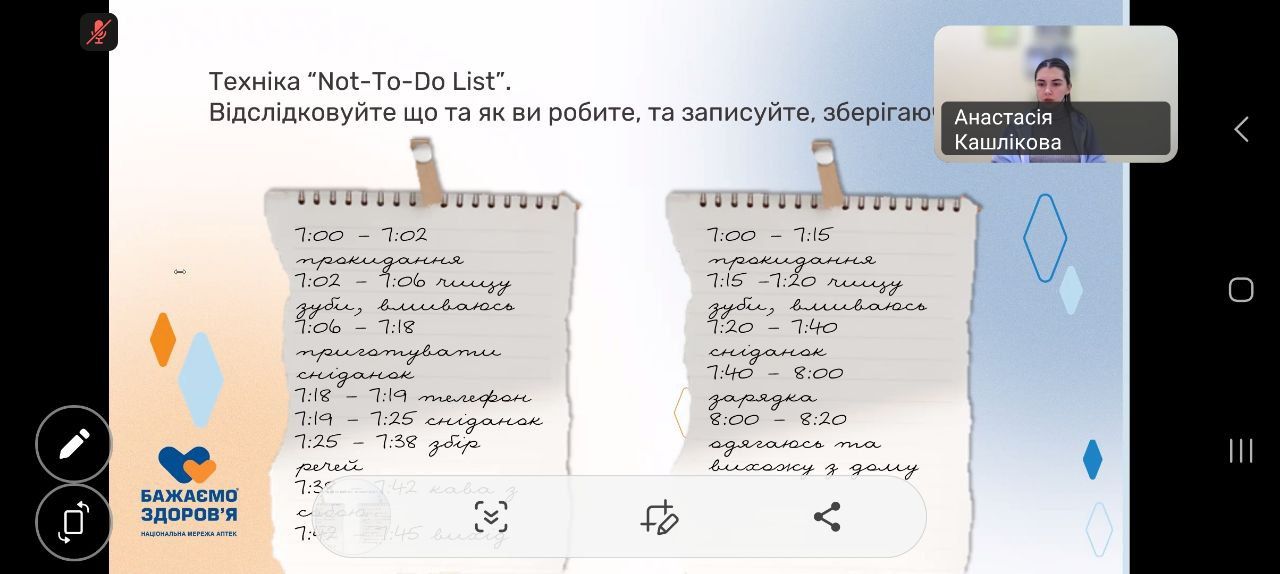 7 січня 2026 року студенти спеціальності 226 Фармація, промислова фармація були запрошені на онлайн-лекцію з тайм-менеджменту, яку провела Анастасія Кашлікова - представниця Національної мережі аптек Бажаємо здоров'я.