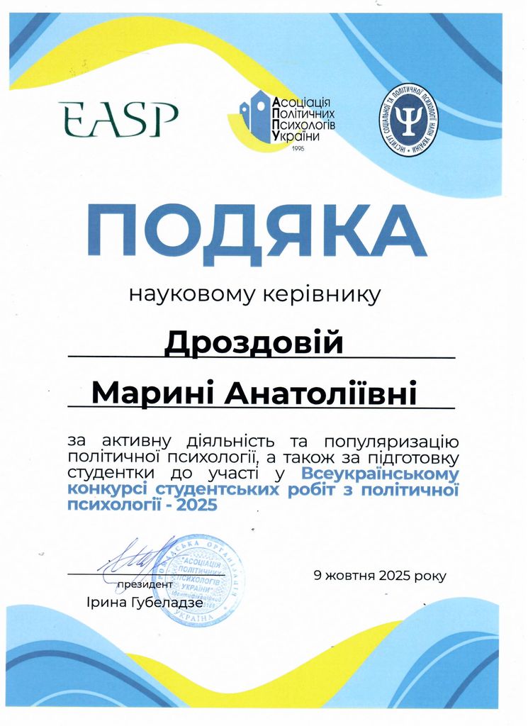 Магістрантка ННІ психології та соціальної роботи НУЧК імені Т.Г.Шевченка спеціальності "Психологія" Юлія Дрозд у 2025 р. взяла участь у Всеукраїнському конкурсі студентських наукових робіт з політичної психології, що був організований Інститутом соціальної та політичної психології НАПН України спільно з Асоціацією політичних психологів України. За підсумками конкурсу здобувачка посіла призове (ІІІ-е) місце (наукова робота «Образи політичних лідерів у політичній свідомості молоді: вікова специфіка»; наук. керівник – доцент кафедри соціальної роботи та освітніх і педагогічних наук М.А.Дроздова).