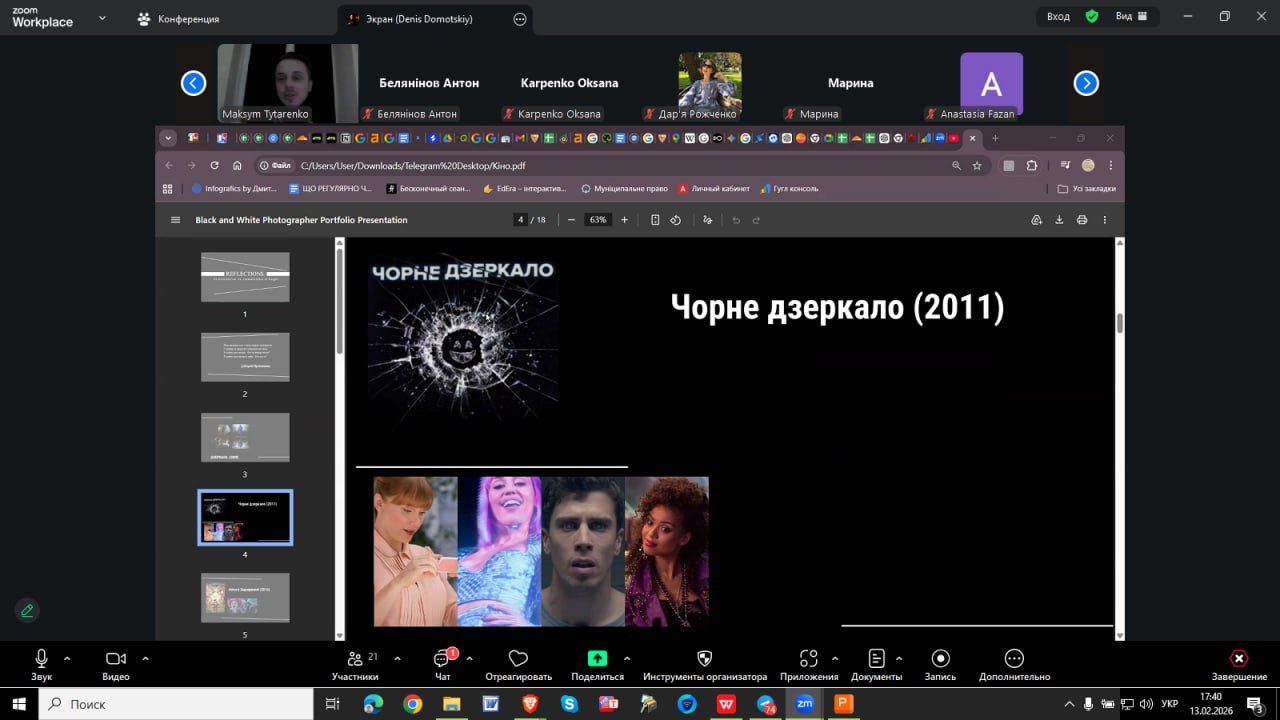 У кінці робочого тижня здобувачі освіти з різних факультетів, інститутів та вищих закладів освіти м. Чернігова зрефлексували щодо образів дзеркала в кіно, фетишів режисерів, мотивів, символів, пов’язаних із цим предметом. Підготовлена презентація студентом філологічного факультету Титаренком Максимом актуалізувала тему дзеркала, дозволила згадати фільми, серіали та подискутувати щодо їх сенсів: «Дзеркала» (Mirrors, 2008), «Чорне дзеркало» (Black Mirror, серіал), «Задзеркалля» (Through the Looking Glass), «Окулус» (Oculus, 2013), «Кендімен» (Candyman, 1992/2021), «Константин: Володар темряви» (Constantine, 2005), «Доріан Грей» (2009), «Анонімні романтики» (2010), «У дзеркала два обличчя» (1996), «Королівство кривих дзеркал» (1963), «Кабірія» (1914), «Гаррі Поттер» (Дзеркало Яцрес) та інші.