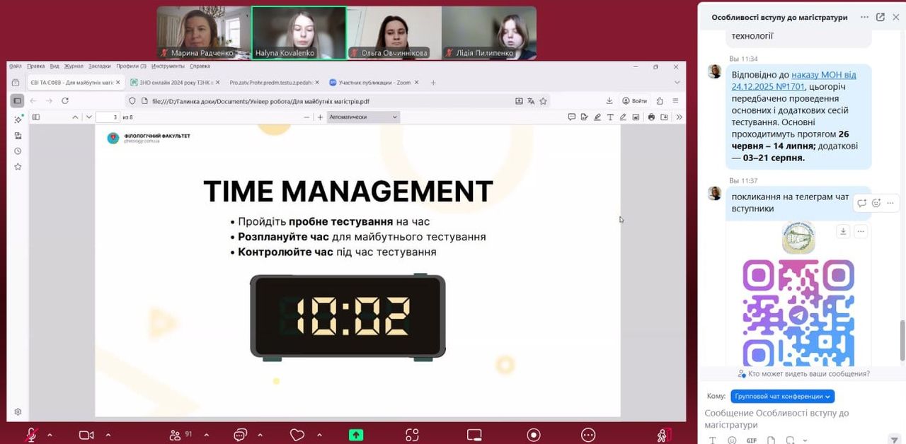 Представники філологічного факультету — заступник декана з молодіжної політики та іміджевої діяльності Марина Радченко, викладач кафедри іноземної філології та освітніх технологій Галина Коваленко та магістрантка Ольга Овчиннікова — детально розповіли студентам про структуру вступних іспитів, ресурси для підготовки та особливості проходження тестування.