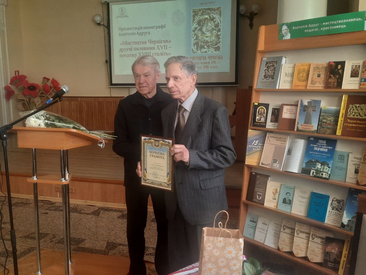 Під час заходу голова Чернігівської обласної організації Національної спілки краєзнавців України, очільник Науково-дослідного центру краєзнавчих студій імені П. К. Федоренка, професор кафедри історії України, археології та краєзнавства Олександр КОВАЛЕНКО вручив Анатолію АДРУГУ почесну грамоту Національної спілки краєзнавців України на знак визнання його вагомого внеску у дослідження історико-культурної спадщини Чернігівщини.