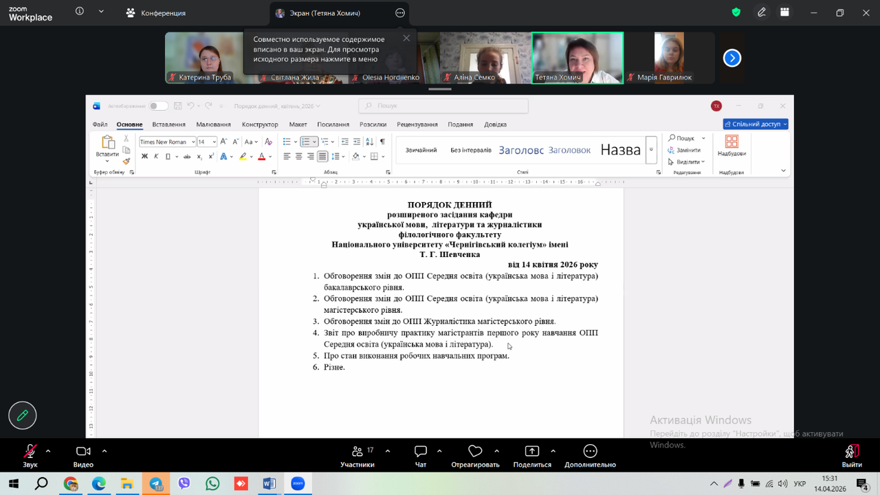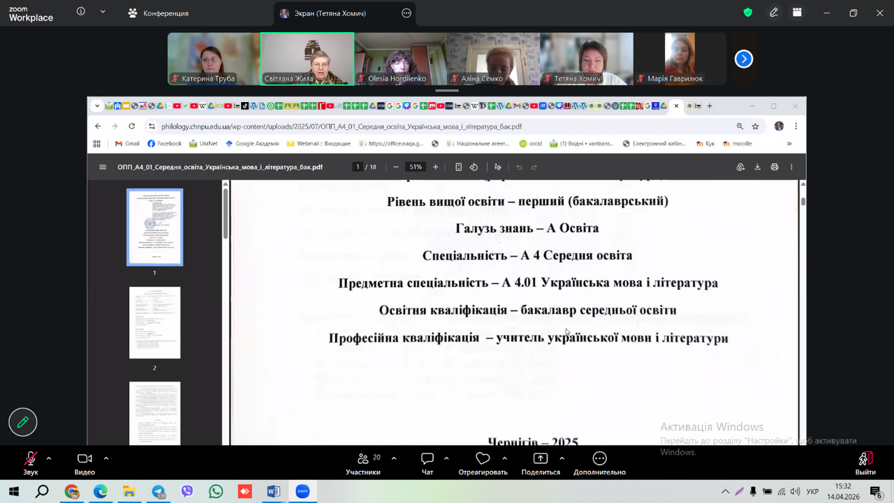 До обговорення доєдналася представник Управління освіти і науки Чернігівської обласної державної адміністрації Тетяна Миколаївна Давидова, яка відзначила активність співпраці програми з Управлінням, результативність участі здобувачів у Міжнародному мовно-літературному конкурсі учнівської та студентської молоді імені Тараса Шевченка та Міжнародного конкурсу з української мови імені Петра Яцика. Тетяна Миколаївна також наголосила на тому, що випускники програми, учителі української мови і літератури, які працюють на освітянській ниві в міських і обласних закладах освіти, є висококваліфікованими фахівцями, подякувала присутнім випускникам-учителям: Дарині Никипорець, Марії Вакулії, Наталії Мирошниченко, Дарині Узел та іншим.